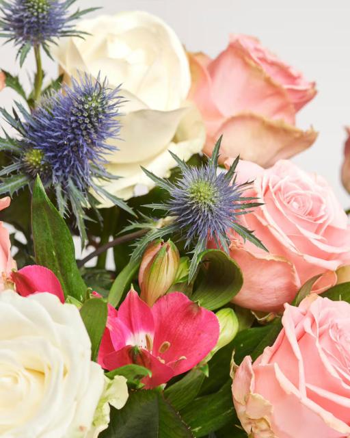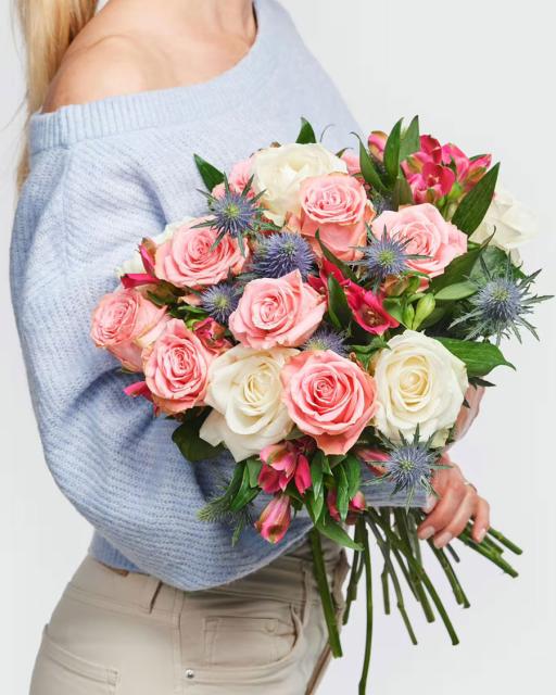 Interflora unikālās ziedu kompozīcijas ir rokām gatavotas Jūsu vietējā ziedu veikalā. Ir pušķi katrai gaumei - no maziem līdz grezniem. Izvēlieties piemērotu cenu, florists izveidos Jums domātu ziedu pušķi, pasniedzot to kā dāvanu. Fotoattēlā redzamais pušķis ir izgatavots izmēru diapazonā "Zelta vidusceļš" — "Deluxe".